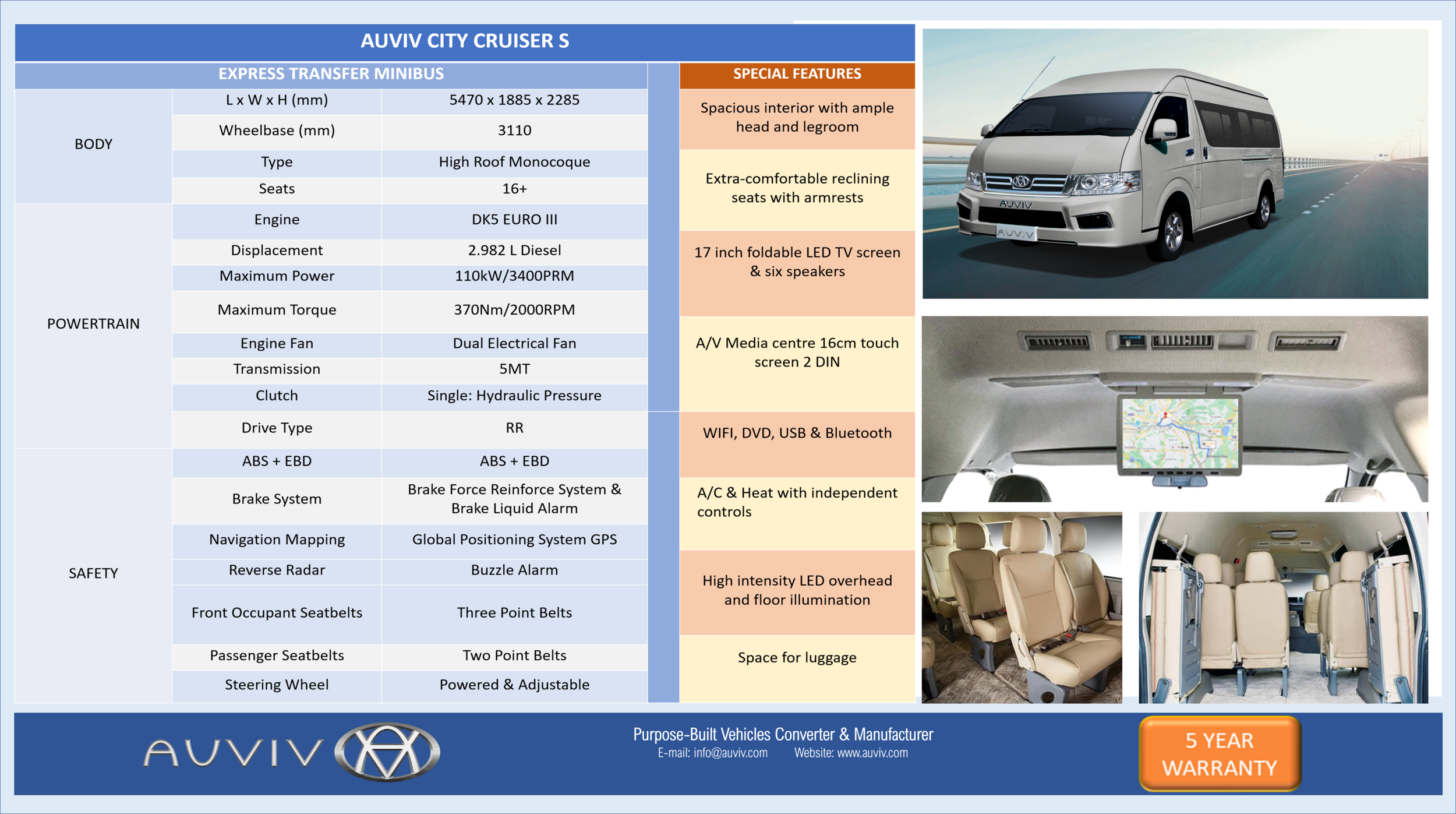 The 16+ seater City Cruiser S is an Executive Express Transfer minibus that combines sleek design, powerful performance, cutting-edge technology and absolute commitment to safety of passengers on board. With All-in-One feature combination, the City Cruiser S emerges as a strong contender to be the Ultimate SHUTTLE Express.